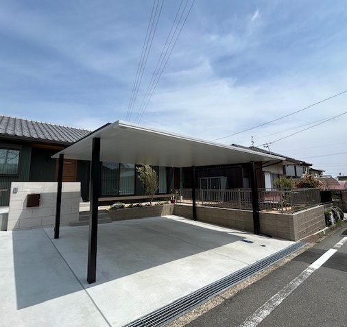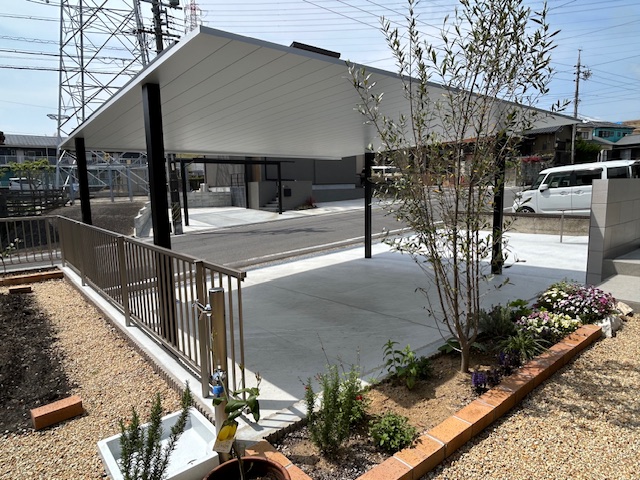 YKKのカーポートプレーンルーフを気に入っていただき 駐車場に施工の新築外構のお宅です。 夏の暑い日差しも遮り、雨樋のお手入れもしやすい構造になっていて機能性も抜群。 とてもかっこよくて、どこからみてもスタイリッシュです。